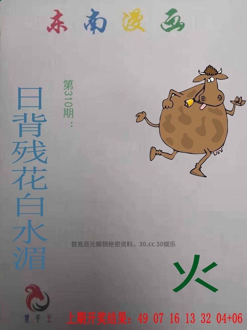 313期:今期生肖一六开,牛来本期看四九。画蛇添足反类犬,绿波有望出旺码。春色红梅香万树,时享运到获大财。四七相加二四合,向上三期博六合。 |